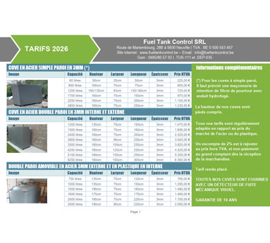 (*) Pour les cuves à simple paroi, Il faut prévoir une maçonnerie de rétention avec enduit hydrofugé et de 50cm de pourtour. La hauteur de nos cuves sont pieds compris. Tous nos tarifs sont régulièrement adaptés en rapport au prix du marché de l'acier ou du plastique. Un escompte de 2% est à rajouter au prix hors TVA, si non-paiement au grand comptant dès la réception de la marchandise. TOUTES NOS CUVES SONT FOURNIES AVEC UN DÉTECTEUR DE FUITE MÉCANIQUE VISUEL.